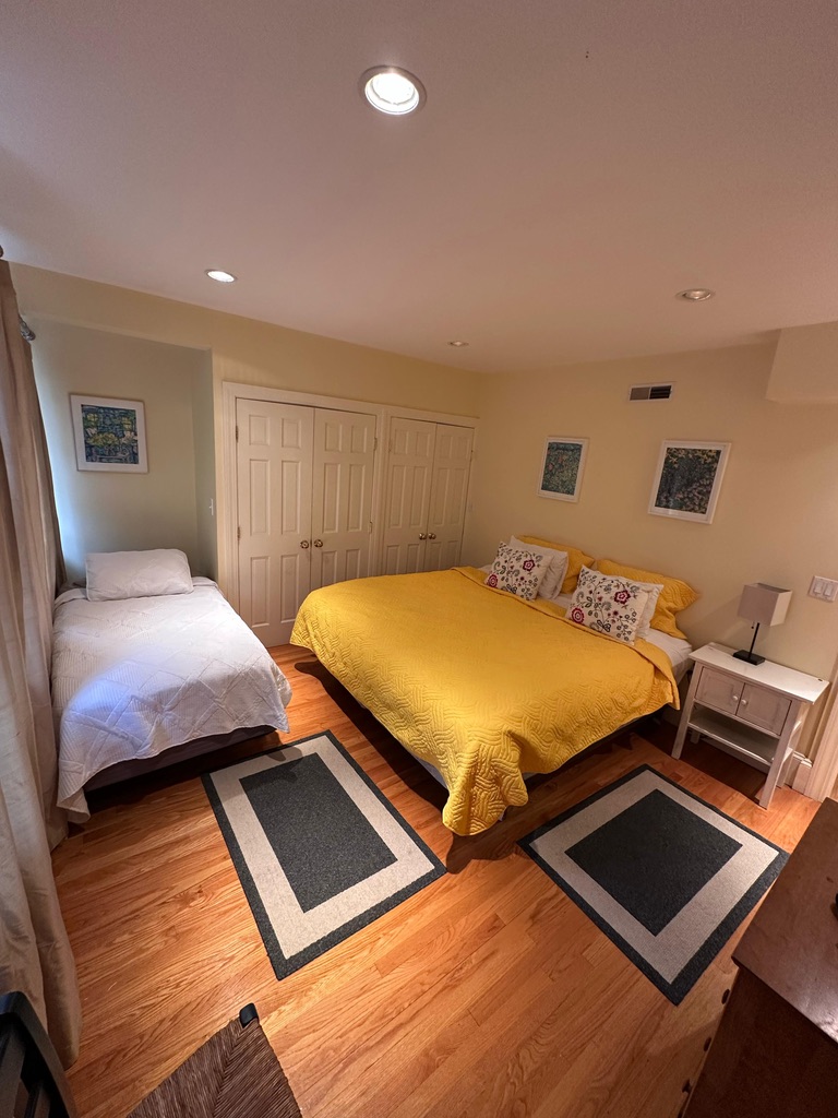 The bedroom itself was cleaned from top to bottom: dusting ceiling to floor including the window frame and sill of the bay window, all furniture surfaces, the inside of the closet, and the floor. Beds made to hotel standard — flat sheet tucked, duvet squared, pillows arranged. The kind of result that makes a room feel reset rather than just tidied.