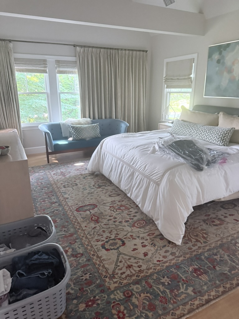 The home is a substantial Cambridge family property with generous room sizes across multiple floors. The master bedroom is a particular focus — a large room with a king bed, high ceilings, tall windows with full-length curtains, and an antique Persian rug that covers most of the floor area. A blue velvet loveseat sits by the window, and the room has the kind of layered, carefully assembled feel that takes time and care to maintain properly.